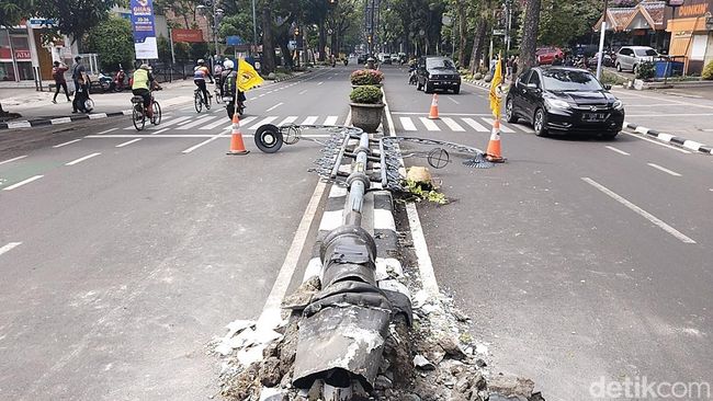 Pantauan detikJabar, tiang PJU yang ambruk itu berada di dekat Superindo, Jalan Dago, Kota Bandung. Kini, insiden tersebut sudah ditangani petugas Dinas Perhubungan.