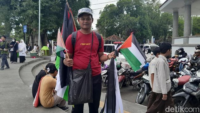 Salah satunya, adalah Iwan. Pria paruh baya asal Garut, yang sejak tiga bulan terakhir sibuk berjualan bendera Palestina di tengah-tengah aksi.