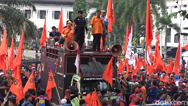 Dalam aksi tersebut, ribuan buruh yang berasal dari berbagai serikat pekerja menuntut penetapan UMK di 27 kabupaten/kota di Jabar, harus sesuai dengan rekomendasi yang sebelumnya telah diusulkan oleh masing-masing bupati dan wali kota.