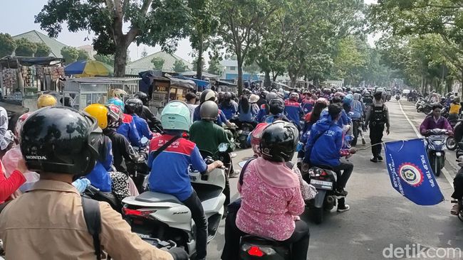 Pantauan detikJabar di Jalan RA Kosasih, terlihat beberapa buruh menggunakan kendaraan motor menyusul rombongan yang sudah lebih dulu tiba di Sukalarang. Mereka memakai seragam sambil membawa atribut bendera serikat.