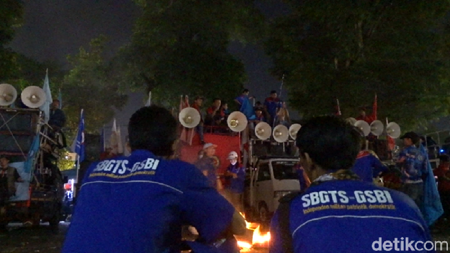 Massa buruh dari berbagai daerah di Jawa Barat masih bertahan di depan Gedung Sate, Kota Bandung pada Rabu (29/11/2023) malam ini. Mereka mengancam akan bertahan hingga pagi hari sebelum bertemu dengan Pj Gubernur Jabar Bey Machmudin.
