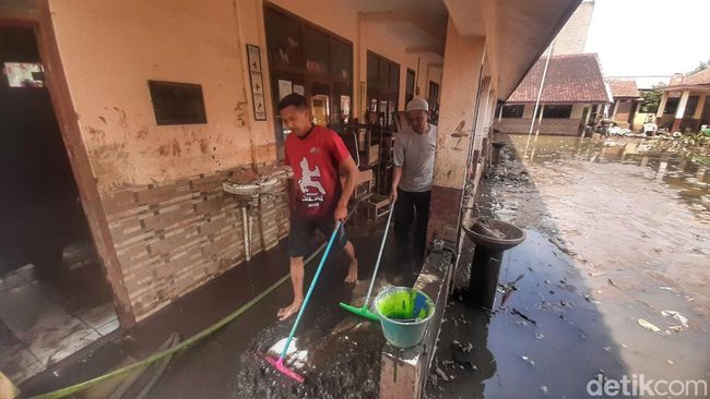 "Awalnya dari mulai malam Sabtu satu sekali, terus pas kedua kalinya kemarin Rabu banjir susulan yang kedua lebih besar lebih tinggi. Itu akibat dari tanggung jebol, air masuk ke sini sama limbahnya sama lumpurnya masuk semua ke sekolah karena ini dataran paling rendah sekolah," ujar Heti, saat ditemui detikJabar.