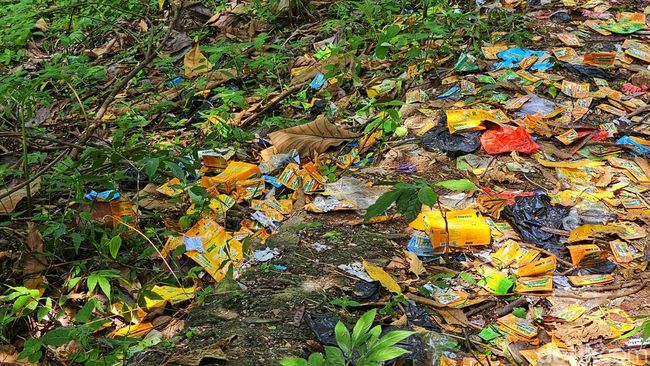 Ribuan bungkus bekas obat saset berserakan di sebuah jalan setapak tidak jauh dari kawasan Bukit Senyum, Desa Citepus, Kecamatan Palabuhanratu, Kabupaten Sukabumi.