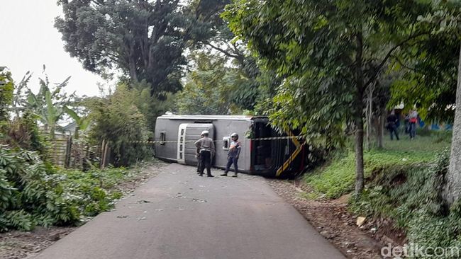 Bus pembawa rombongan pelajar asal Kabupaten Ciamis terguling di Kawasan Bumi Perkemahan Kiarapayung, Sukasari, Sumedang, Minggu (24/12/2023).