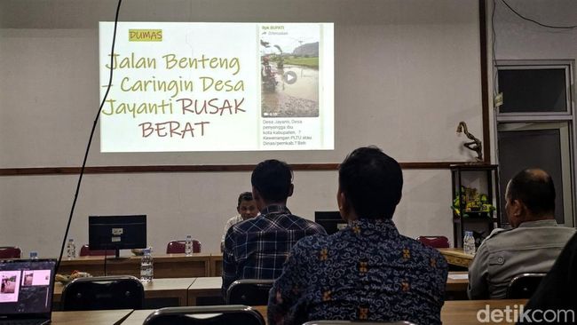 Ali memperlihatkan tangkapan layar pesan dari Bupati Marwan di sebuah layar besar. Terlihat Marwan meneruskan video yang dikirim masyarakat dengan narasi yang tersemat.