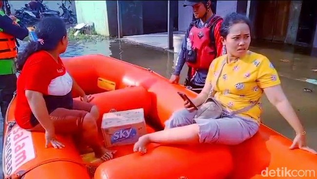 Jarak rumah Herni menuju tempat perbelanjaan cukup jauh. Biasanya jika tidak banjir, ia menggunakan sepeda motor. Namun kini Herni terpaksa meminta tolong kepada tim SAR yang sedang bertugas mengevakuasi warga.