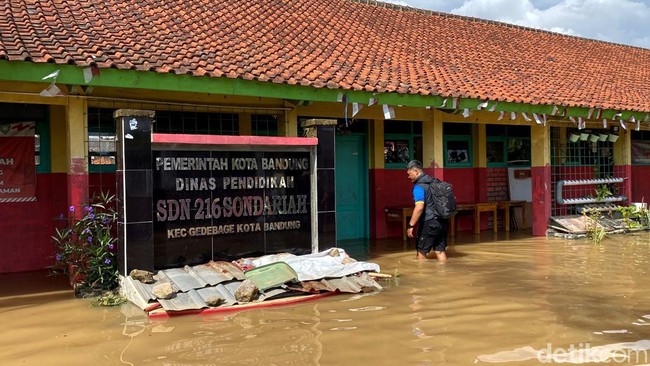 Pantauan detikJabar, Jumat (12/1/2024), banjir merendam SDN 216 Sondariah yang berada di Kelurahan Rancanumpang, Kecamatan Gedebage, Kota Bandung. Ketinggian banjir yang merendam bangunan sekolah ini beragam bahkan hingga sekitar 50 sentimeter.