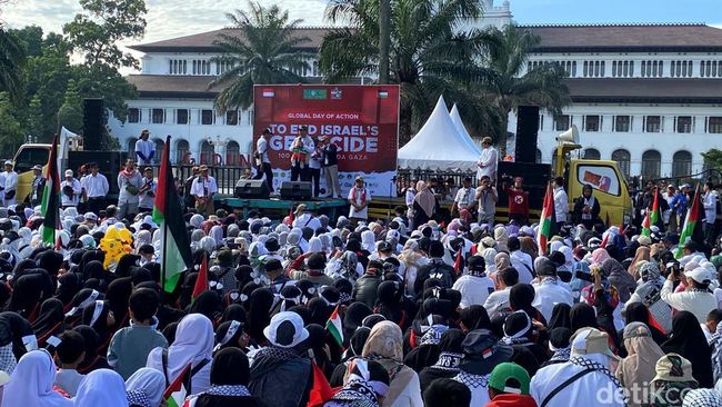 Pantauan detikJabar, Sabtu (13/1/2024) ribuan massa aksi berkumpul di depan Gedung Sate Bandung. Dalam aksi ini, mereka juga membawa poster hingga bendera Palestina.