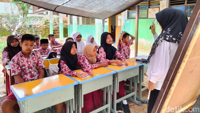 Teti menyebut dari sebanyak 68 siswa yang ada, siswa dari kelas 3, kelas 4 dan kelas 6 di antaranya terpaksa belajar bernaungkan tenda terpal.
