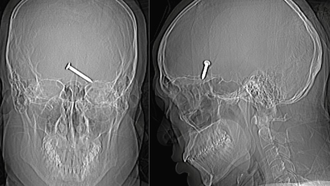 Hasil rontgen tengkorak kepala pria tersebut menunjukkan bahwa paku tersebut telah menembus lobus frontal otaknya, menyebabkan rongga matanya retak, dan ada bukti perdarahan yang meluas ke area otak di sekitarnya.