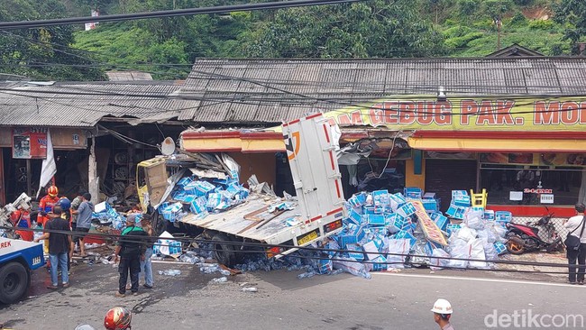 Tak hanya tabrak kendaraan, truk boks itu juga menabrak sebuah rumah makan dan juga toko velg mobil. Kedua bangunan itu mengalami kerusakan cukup berat, salah satunya jendela rumah makan hancur.
