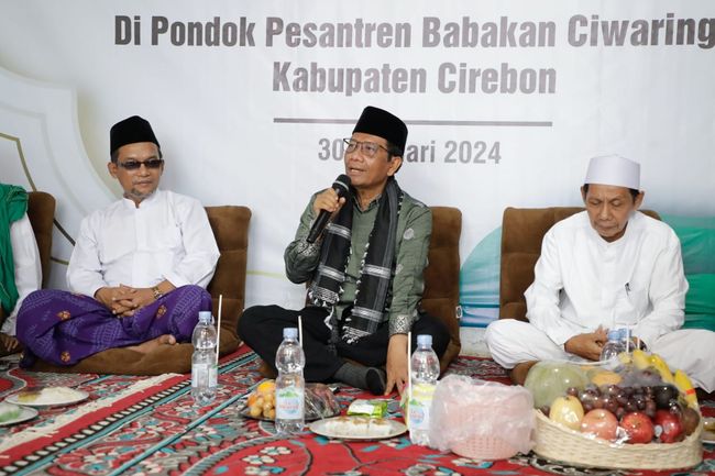 "Saya bersyukur hari ini bisa bertemu hari ini dalam suasana yang sangat syahdu. Biasanya kalau ketemu ramai-ramai, teriak-teriak, tapi ketemu dalam suasana ini di sebuah pesantren yang tertua di Indonesia. Dari sini, dari Babakan Ciwaringin saya tahu telah lahir kiai-kiai besar sekaligus pejuang-pejuang besar yang membawa tradisi kepesantrenan yang sampai saat ini kokoh," ujar Mahfud.