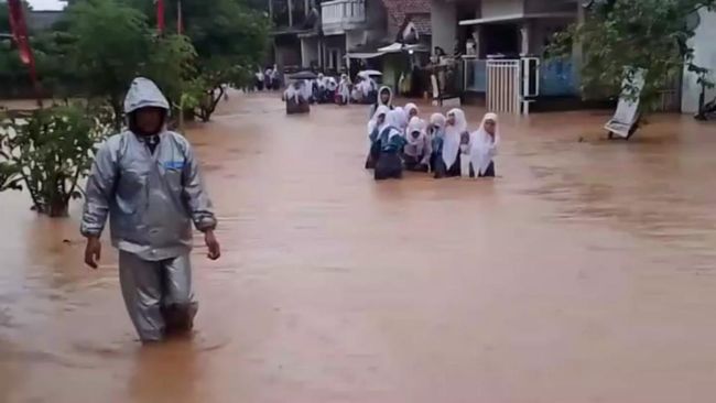 Pelajar yang hendak pulang sekolah harus menerobos genangan banjir tersebut.