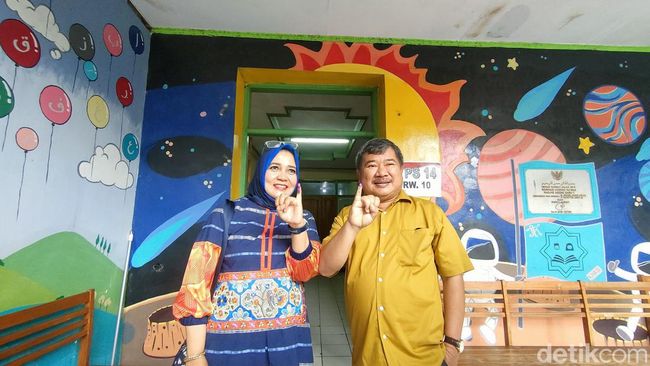 Eks Bupati Garut Rudy Gunawan memberikan hak pilihnya di Pemilu 2024 dengan sang istri, Diah Kurniasari. Rudy-Diah kompak nyoblos meskipun berbeda pilihan.