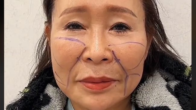 Foto yang diunggah menampilkan wanita itu sebelum dioperasi. Di wajahnya tampak coretan-coretan yang menjadi tanda area yang akan dikerjakan yakni di area pipi, rahang, dan dahi.