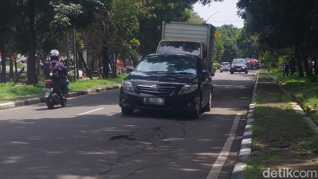 Pantauan detikJabar, Jumat (1/3/2024), kerusakan jalan terjadi di lajur tengah yang ada di ruas Jalan Pahlawan. Kondisi jalan retak-retak dan miring.