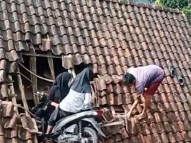 Beruntung, meski genting dan atap hancur, pemotor dan dua orang yang diboncengnya lolos dari maut. Mereka tidak alami luka hanya syok.