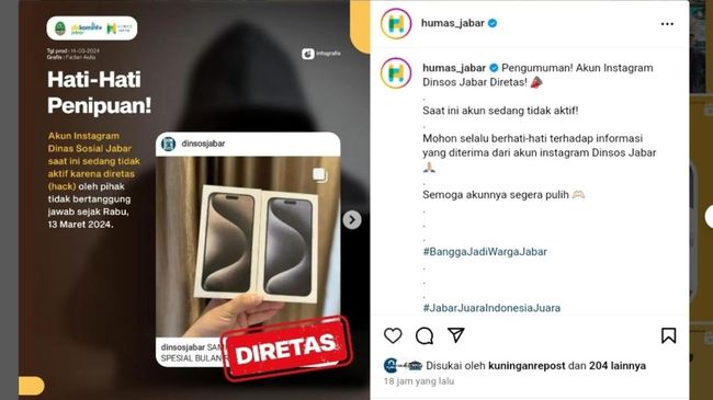 "Hati-hati penipuan! Akun Instagram Dinas Sosial Jabar saat ini sedang tidak aktif karena diretas (hack) oleh pihak tidak bertanggung sejak Rabu, 13 Maret 2024," tulis keterangan akun Instagram @humas_jabar.