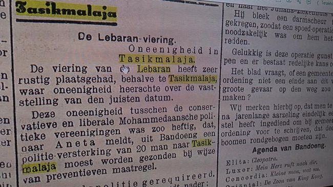 "Perayaan Lebaran berlangsung sangat damai, kecuali di Tasikmalaja yang terjadi perselisihan pendapat mengenai penentuan tanggal yang tepat. Perbedaan pendapat antara asosiasi politik Islam yang konservatif dan liberal ini begitu kuat sehingga, menurut Aneta, 20 orang polisi harus dikirim dari Bandung ke Tasikmalaja sebagai tindakan pencegahan," demikian tulis artikel koran berbahasa Belanda.