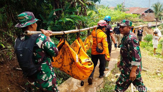 Jasad yang berhasil dievakuasi, dimasukkan ke kantong jenazah. Jasad kemudian diboyong dengan cara digotong karena akses di lokasi longsor terputus tak bisa dilalui kendaraan roda dua.