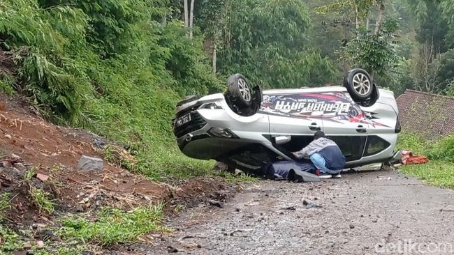 Setelah itu mobil tergelincir hingga berguling dan jatuh terbalik di jalan kampung yang berada di bawah jalan raya.