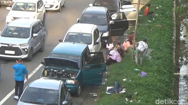 Belasan kendaraan pemudik memilih parkir di bahu jalan, seperti pantauan detikJabar di tol Cikampek kilometer 72, sekitar pukul 17.30 WIB. Kendaraan berjejer memanjang ke belakang dengan beragam kegiatan pemudik.
