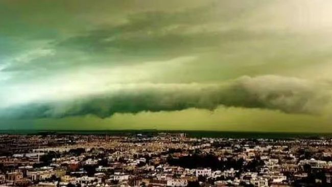 Di antara banyak video hujan dari kota yang diguyur itu, terdapat satu video time-lapse viral di media sosial yang menunjukkan langit kelabu berubah menjadi hijau kabur.
