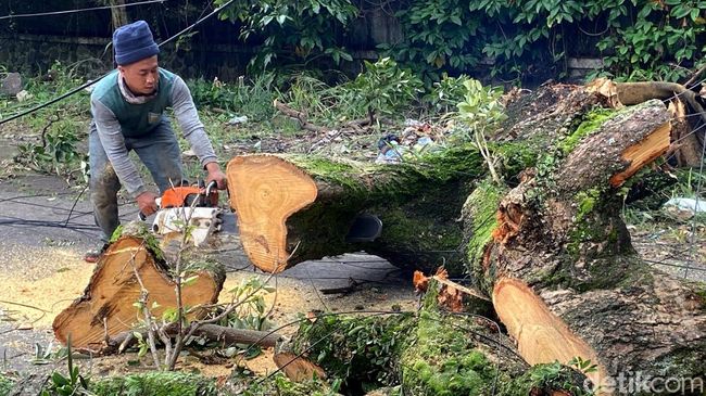 "Gergajinya beratnya 15 kilogram," kata Yayat saat membuka perbincangan dengan detikJabar di lokasi pohon tumbang, Selasa (23/4/2024).
