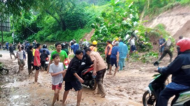 "Sempat tertutup, tapi langsung dievakuasi. Kita utamakan memotong dulu pohon tumbang supaya akses bisa dilewati baru kita evakuasi material longsornya yang menutup sebagian badan jalan," kata Ceceng.