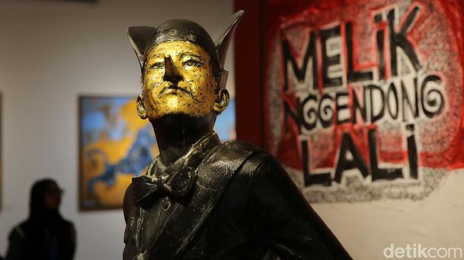 Bandung - Butet Kartaredjasa menggelar pameran tunggal di Galeri Nasional. Patung Petruk berwajah emas menjadi penyambut para wisatawan.