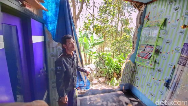 "Tembok kamar, retak, kamar mandi, yang paling mengkhawatirkan mah ya ini tembok kamar. Sekarang ditutup sementara pakai terpal biar gak hujan," ucapnya.