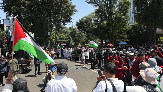 Pantauan detikJabar pukul 11.30 WIB, seribuan mahasiswa hingga dosen menggelar aksi demo di depan Gedung Sate. Mereka memprotes perang yang tak kunjung berhenti di Gaza. Mahasiswa juga menyerukan aksi boikot terhadap produk-produk Israel.