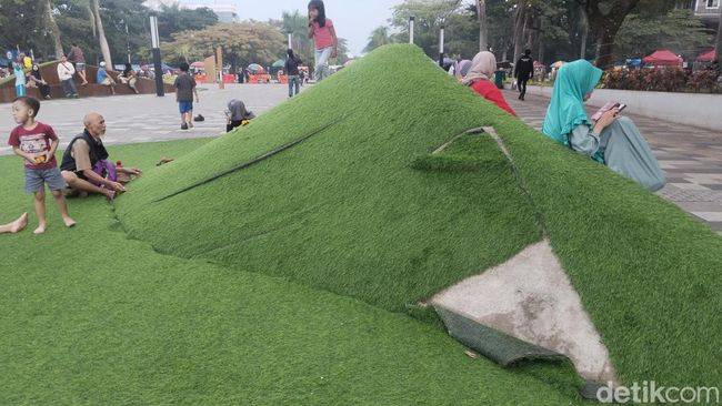 Sekadar diketahui, bukit yang ukurannya tidak begitu tinggi dan sekilas terlihat mirip bukit di serial anak Teletubbies itu dilapisi rumput sintetis di atasnya. Pantauan detikJabar, Jumat (10/5/2024), sayangnya, rerumputan yang biasa digunakan anak-anak bermain perosotan itu sekarang banyak yang mengelupas dari posisi asalnya.