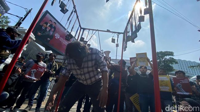 Massa aksi juga menggelar aksi teatrikal. Massa membawa keranda merah. Kemudian, salah seorang jurnalis diikat di keranda tersebut. Puluhan kartu pers pun digantung di keranda merah.
