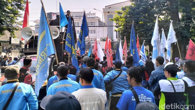 Pantauan detikJabar di lokasi pukul 12.00 WIB, massa buruh datang dari berbagai wilayah di Bandung Raya. Mereka melakukan aksi longmarch lebih dulu sebelum berorasi di depan gerbang DPRD Jabar di Jalan Diponegoro, Kota Bandung.