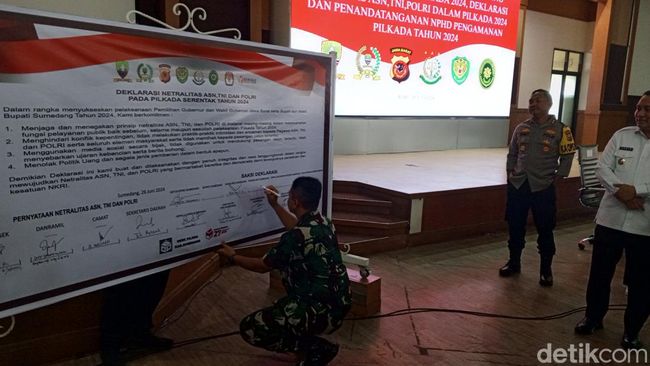Deklarasi netralitas ASN tersebut disampaikan di Aula Tampomas, Pusat Pemerintahan Sumedang (PPS), Rabu (26/6/2024). Usai membacakan deklarasi, ASN yang terdiri dari Camat hingga TNI, Polri langsung melakukan penandatanganan sebagai tanda menjaga netralitas ASN di Pilkada 2024 mendatang.