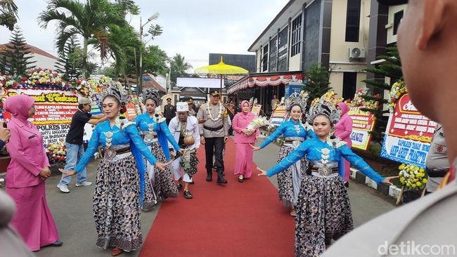 Kedatangan Haris Dinzah disambut tradisi Sunda Ki Lengser dan tarian rampak gendang di Mapolres Tasikmalaya, Rabu (17/7/2024).