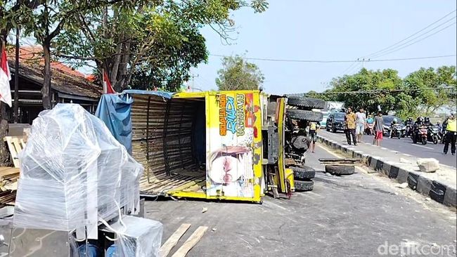 "Bawa barang ekspedisi dari Solo ke Sumatera, mobil menabrak trotoar, sampai roda ban depan terlepas. Kemudian truk itu terguling," katanya.