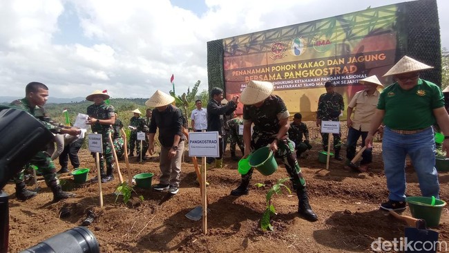 Panglima Kostrad Letjen TNI Muhammad Saleh Mustafa melakukan penanaman pohon kakao dan jagung di lahan ketahanan pangan Kostrad, kawasan Gedebong Desa Sindangasih Kecamatan Cikatomas Kabupaten Tasikmalaya, Rabu (14/8/2024).