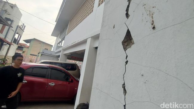Pantauan detikJabar, tembok dan bagian pondasi bangunan tiga lantai tersebut mengalami retak parah. Bahkan gedung yang terlihat megah tersebut tampak rapuh apabila dilihat dengan banyaknya kerusakan tersebut.