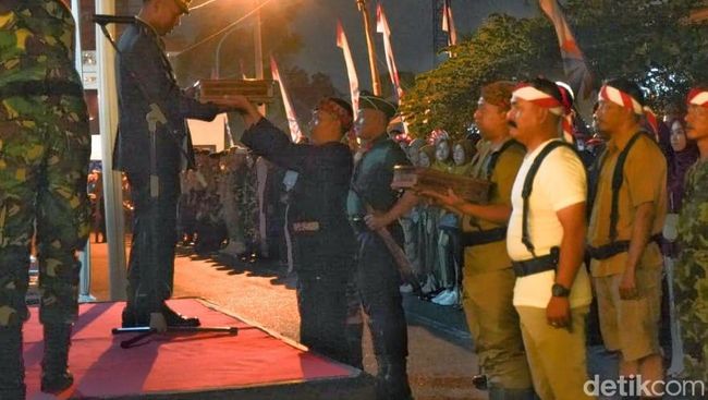 Meriahnya upacara Taptu, tradisi kemiliteran yang dilakukan di malam menjelang hari kemerdekaan yang digelar Forkopimda Kabupaten Karawang berjalan khidmat.
