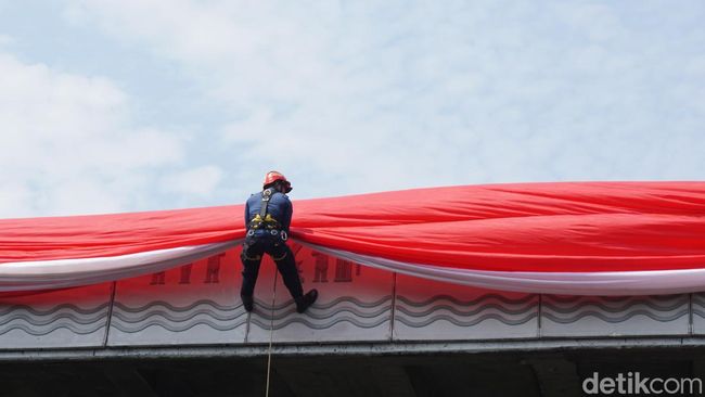 Pengibaran bendera raksasa ini dilakukan pada Sabtu (17/8/2024) tepat pukul 10.05 WIB. Empat petugas Diskar PB Kota Bandung harus mempertaruhkan keselamatan mereka demi mengibarkan bendera berukuran 20x4 meter.