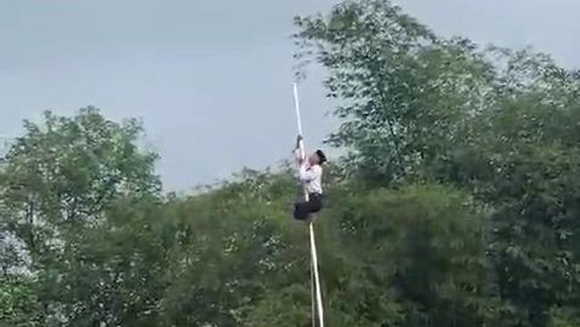 "Jadi memang talinya lepas saat mau pengibaran bendera merah putih, sempat terhenti untung ada ananda Reza yang dengan heroik naik dan ambil tali ini. Kami berterimakasih dan sudah diapresiasi ananda ini selepas upacara," tambah Uu.