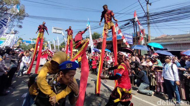 Seorang pemain egrang terjatuh dari ketinggian 4 meter usai tertabrak petugas Satpol PP yang tengah membawa warga pingsan saat Helaran Budaya Cianjur, Minggu (18/8/2024). Akibatnya pemain egrang tersebut mengalami luka-luka setelah membentur aspal dan pagar pembatas.