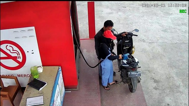 Setelah memarkirkan sepeda motornya di depan alat pengisian BBM, pelaku turun untuk membuka jok sepeda motornya. Pelaku yang mengenakan jaket hitam itu awalnya berdiri di sebelah kanan korban. Namun kemudian pelaku berpindah ke sebelah kiri korban.