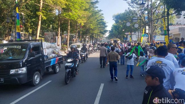 Lajur kiri digunakan pengendara umum dan lajur kanan digunakan untuk kendaraan hias. Tak hanya pengendara, terlihat juga warga yang hendak lari pagi dan bersepeda masih melintas di jalan itu.