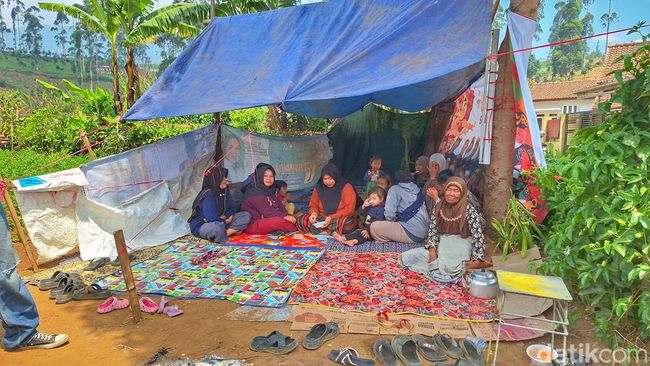 Kondisi itu dirasakan warga yang mengungsi di ladang kebun Desa Cikembang, Kecamatan Kertasari, Kabupaten Bandung. Kondisi pengungsian pun seadanya hanya beralas karpet dan atap terpal. Sedangkan dindingnya dari spanduk.