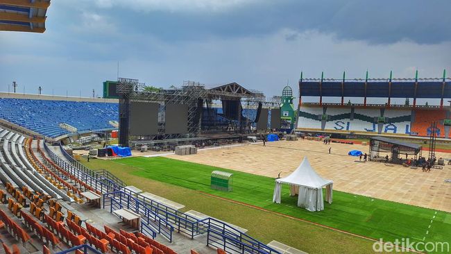 Pantauan detikJabar di lokasi, tampak sejumlah pekerja tengah mempersiapkan konser tersebut. Panggung rigging dengan ukuran besar telah terpasang di dalam stadion bagian utara. Kemudian pada area rumput telah dilapisi alat khusus supaya tidak mengalami kerusakan.