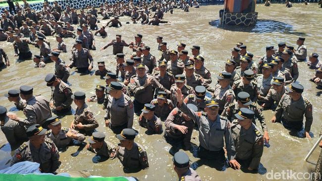 Momen menarik terjadi setelah upacara Pendidikan Alih Golongan (PAG) dari Bintara ke Perwira Polri di Setukpa Lemdiklat Polri, Sukabumi, Senin (7/10/2024). Ratusan polisi berseragam nampak turun memasuki Kolam Rajawali.