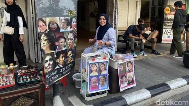 Di antara deretan lapak jasa melukis atau menggambar orang secara langsung di sepanjang trotoar jalan Braga, terlihat satu lapak yang menawarkan jasa yang cukup berbeda dan unik. Tepat di depan Rumah Seni Ropih, Rahma Widya (49) duduk bersebelahan dengan spanduk bertuliskan 'Face Painting di Braga'.